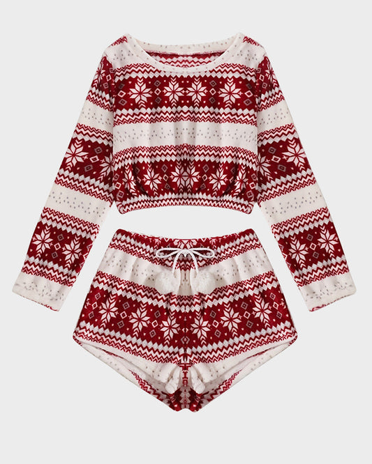 Festive Pattern Coral Fleece Long Sleeve Top and Shorts Set