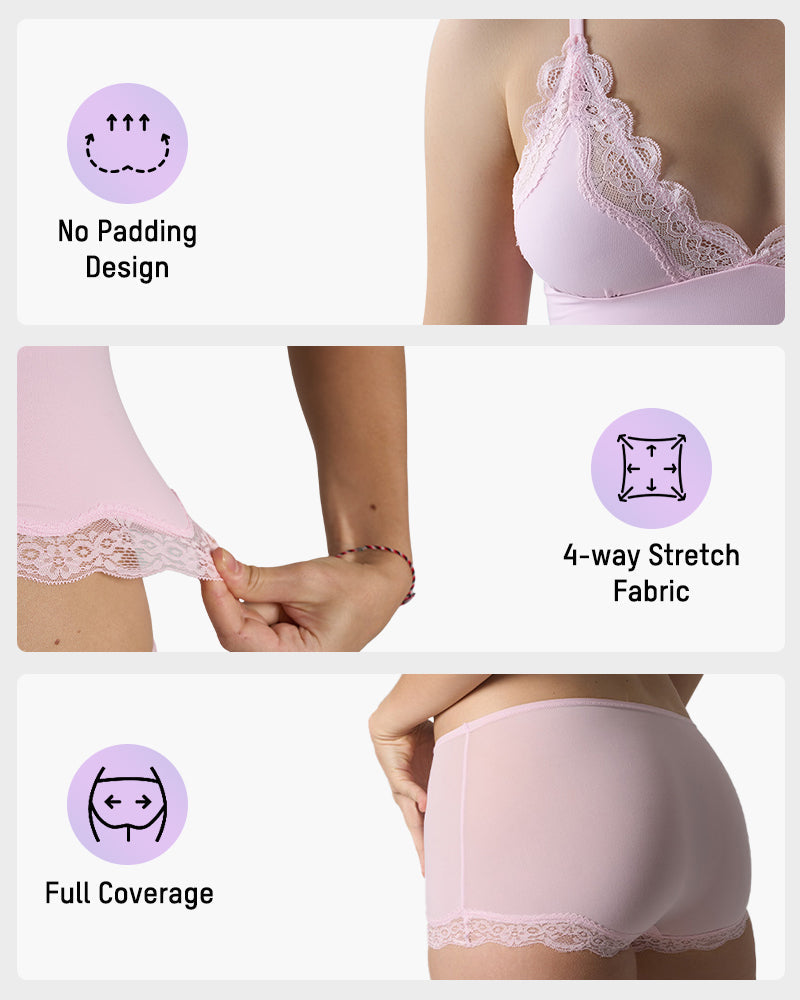 Slip into something that feels like a gentle hug. This lace-trim camisole and boyshorts set is soft, breathable, and beautifully feminine — perfect for lounging, layering, or sleeping in style. Every detail is made to flatter and move with your body, effortlessly elegant from day to night.