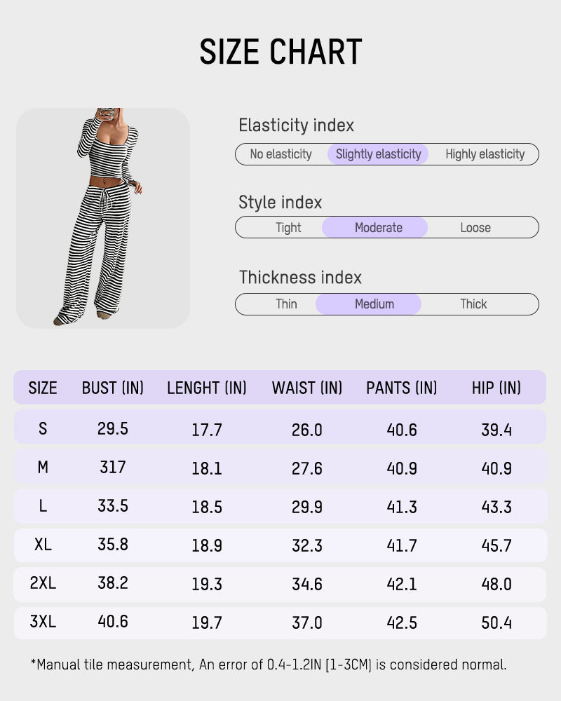 Turn lazy mornings into stylish moments with this striped two-piece lounge set. Designed for women who love to look effortlessly chic, this outfit pairs a sculpting square-neck crop top with low-rise, floor-length wide-leg trousers. It’s your go-to look for coffee runs, casual dates, or lounging in comfort—because cozy should always look this good.